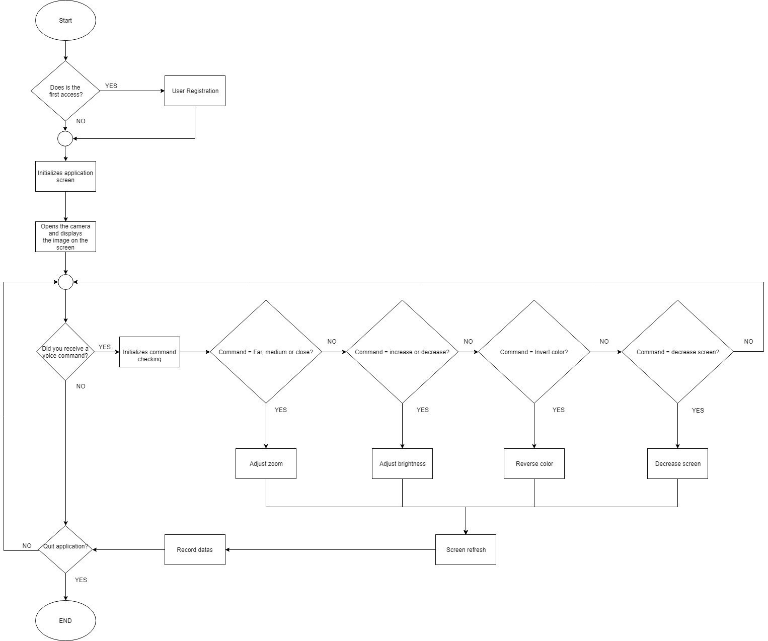Many people with total or partial visual impairment can use assistive technology (AT) to facilitate daily living activities. Smartphones and, especially, their applications, can be a tool of easy access and applicability as AT. The aim of this study was to develop an application for use on a smartphone or tablet to improve the visual ability of people with low visual acuity. The software, called Oftcam, was developed using the ANDROID operating system, written in Java Android under the Java version JDK 1.7, supporting the minimum version of Android 2.2. Its operating mechanism includes capturing and adjusting the image of interest to the users according to their needs: expansion, change of background and decentralization of the image of interest. The development of this free, easy-to-handle application will provide the possibility of integration between the user and the auxiliary professional, being, in practice, a mobile resource of health. Considering that most people have an increasing access to phones and tablets, we believe the use of this application is a good alternative to integrate the need and practicality in the daily lives of the visually impaired people.