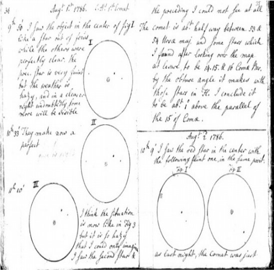 - Esboço do cometa C/1786 P1 (Herschel) descoberto por Caroline Herschel em agosto de 1786.