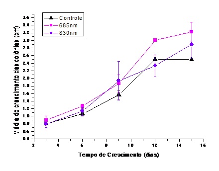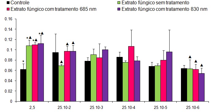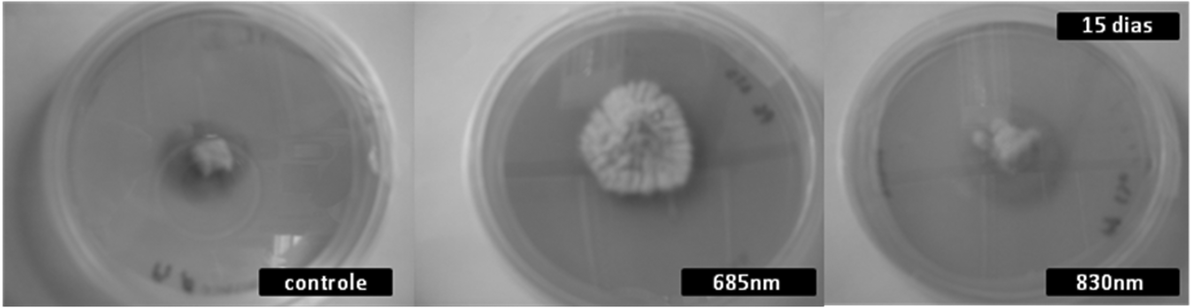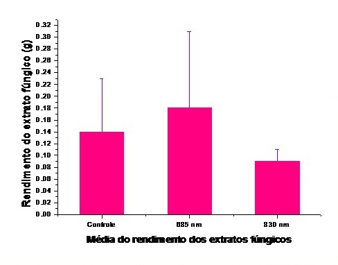 A ação do laser arseneto de gálio alumínio (GaAlAs) nos comprimentos de onda 685nm e 830nm em cultura de Trichophyton rubrum, foi estudada visando obter os metabólitos secundários e avaliar a citotoxicidade dos mesmos em cultura de células. Foram utilizadas cepas do dermatófito T. rubrum provenientes do laboratório de Microbiologia da Universidade do Vale do Paraíba. O cultivo foi realizado em meio de cultura sólido de ágar Sabouraud (Merck, Alemanha) em placa de Petri. A colônia de T. rubrum foi irradiada com o laser (GaAlAs) a uma distância de 1cm da placa e incubadas em estufa 26ºC. Para o ensaio de citotoxicidade foi utilizada a linhagem ce-lular L929 (tecido conjuntivo de camundongo) proveniente do laboratório Adolf Lutz em São Paulo. As células foram plaqueadas e incubadas com o extrato fúngico em diferentes concentrações, por 1 h. Após esta incubação foi reali-zado o teste de Metil tiazol tetrazólio (MTT) para avaliação da citotoxicidade. Obteve-se uma diferença no cresci-mento das colônias controle e irradiadas a 685 nm estatisticamente significante (p<0,05). Na análise estatística com-parativa da citotoxicidade causada pelos extratos nas concentrações 2,5 mg/ml e 25x10-6 mg/ml, foi obtido p<0,05, o mesmo ocorreu entre as concentrações 25x10-2 mg/ml e 25x10-6 mg/ml. Na concentração de 25x10-2 mg/ml, observa-se uma elevação considerável (78,55%) na atividade mitocondrial dos grupos com tratamento em relação ao controle. O laser GaAlAs, nas condições metodológicas deste estudo, apresentou efeitos no metabolismo celular, alteração de morfologia e da taxa de crescimento da colônia in vitro. O extrato fúngico das colônias irradiadas apre-sentou efeito bioestimulador quando comparado ao extrato obtido do grupo controle e sem tratamento com laser.
